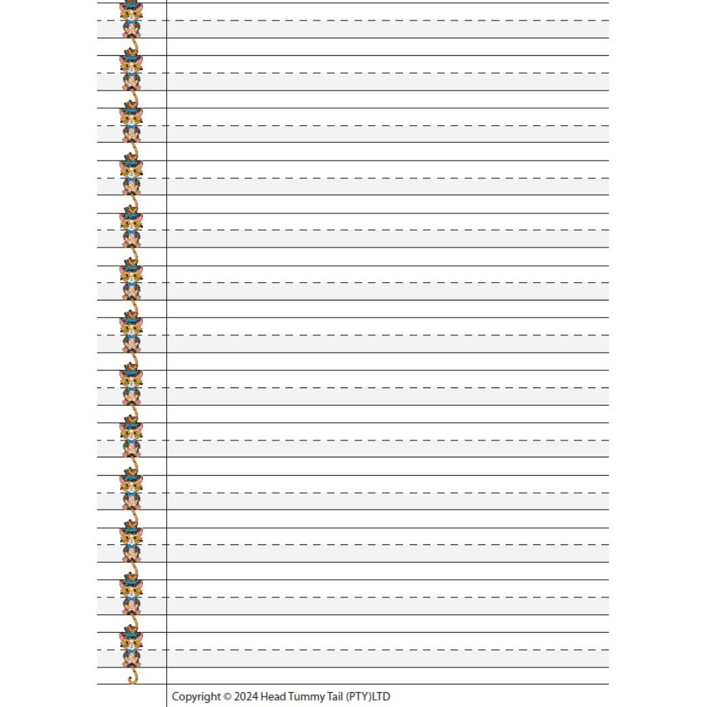 General classroom writing (Grades 2 – 3). Distinctive Irish ruling with a margin, tighter line spacing.